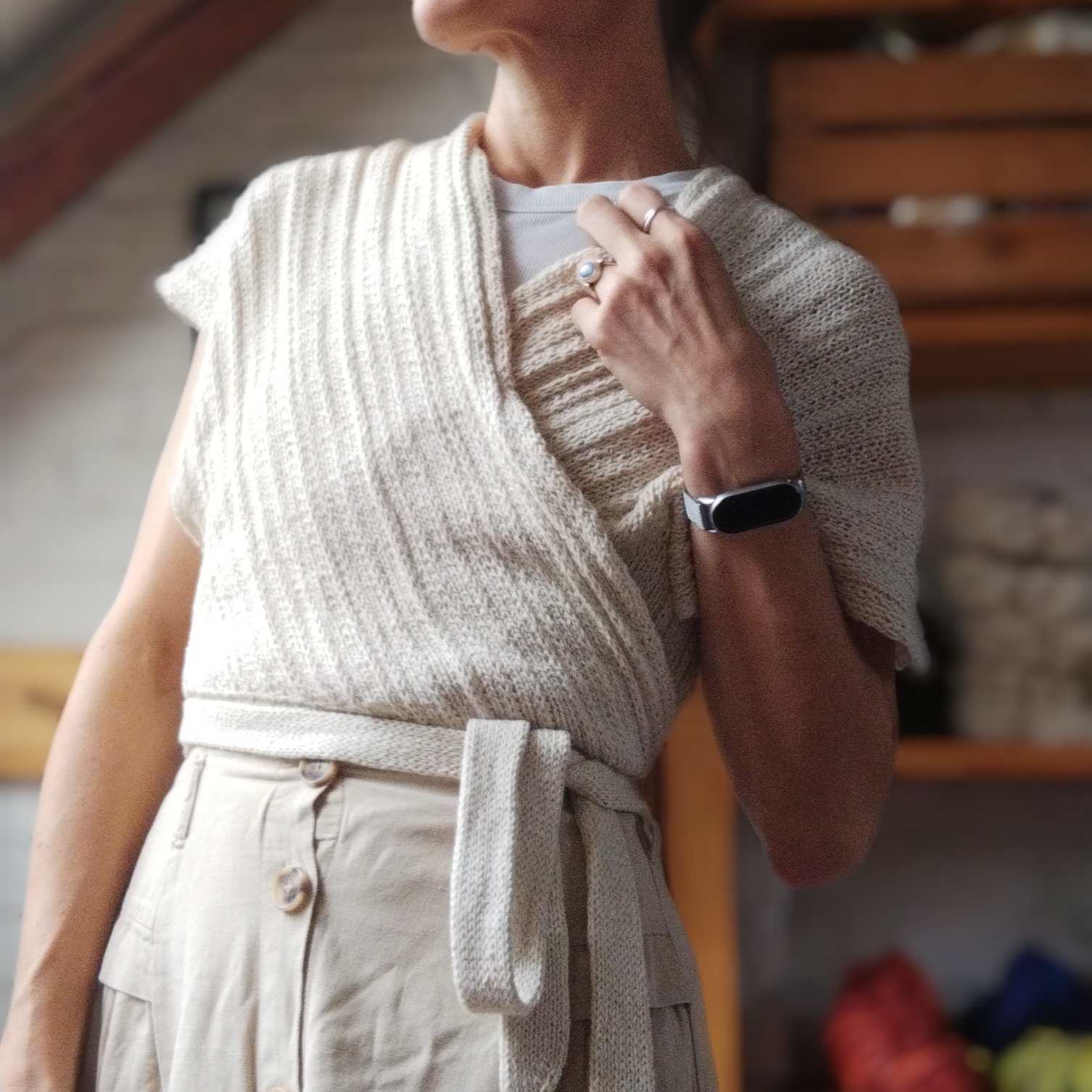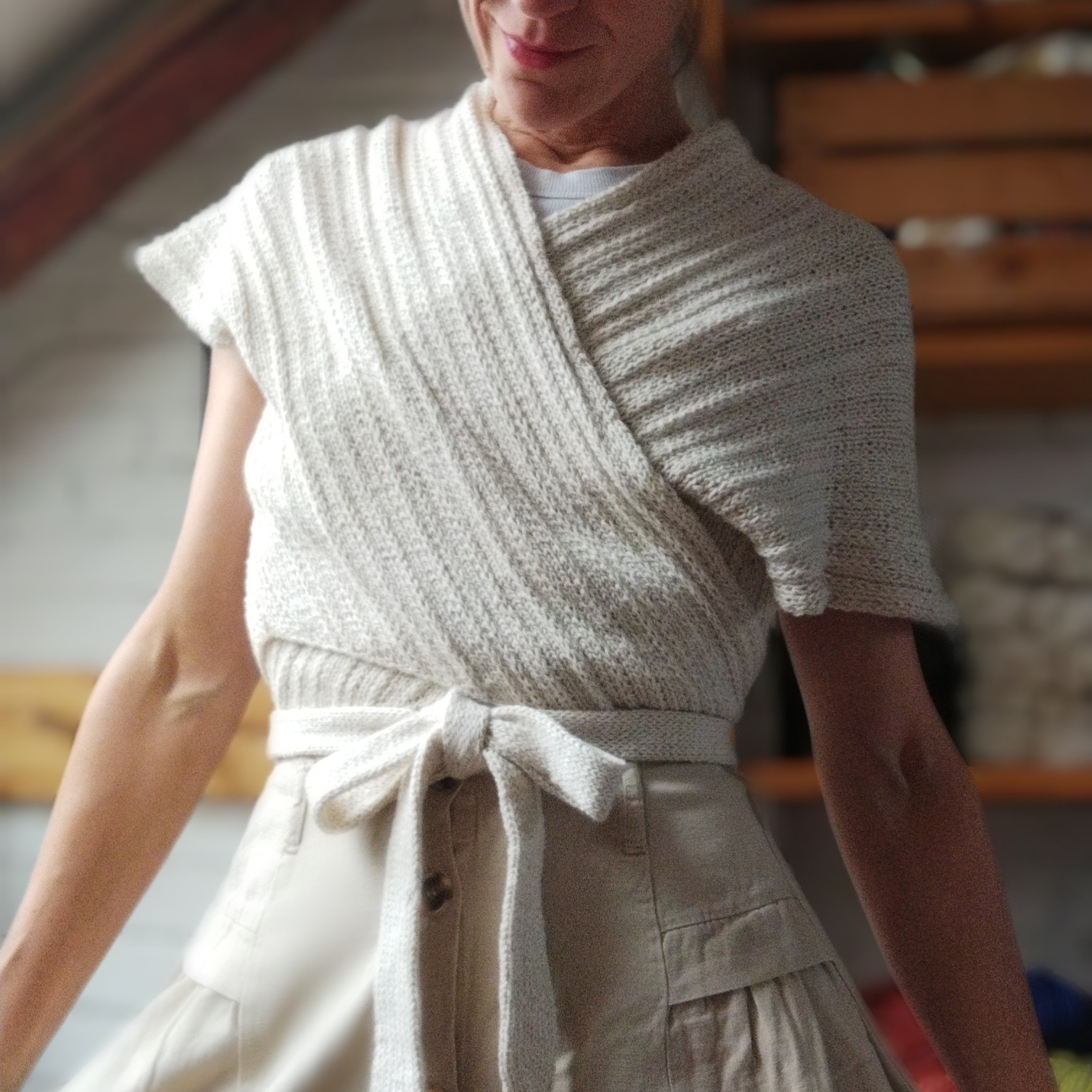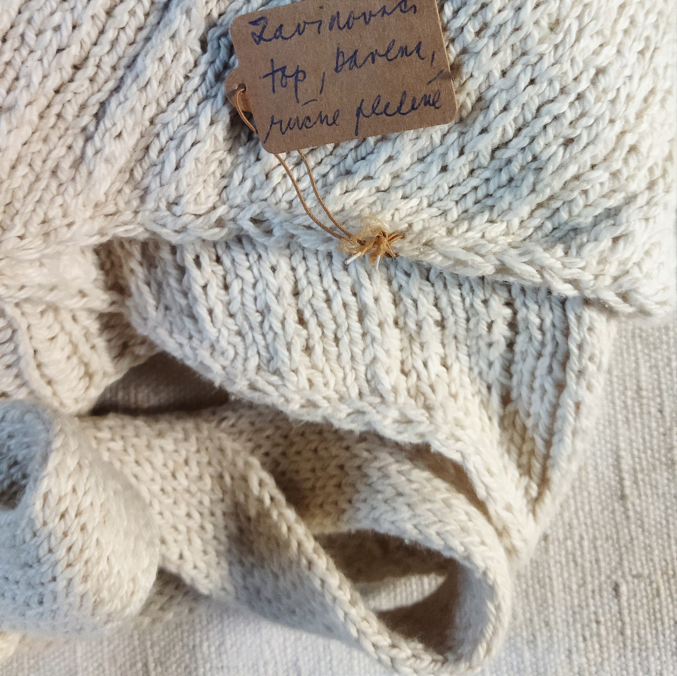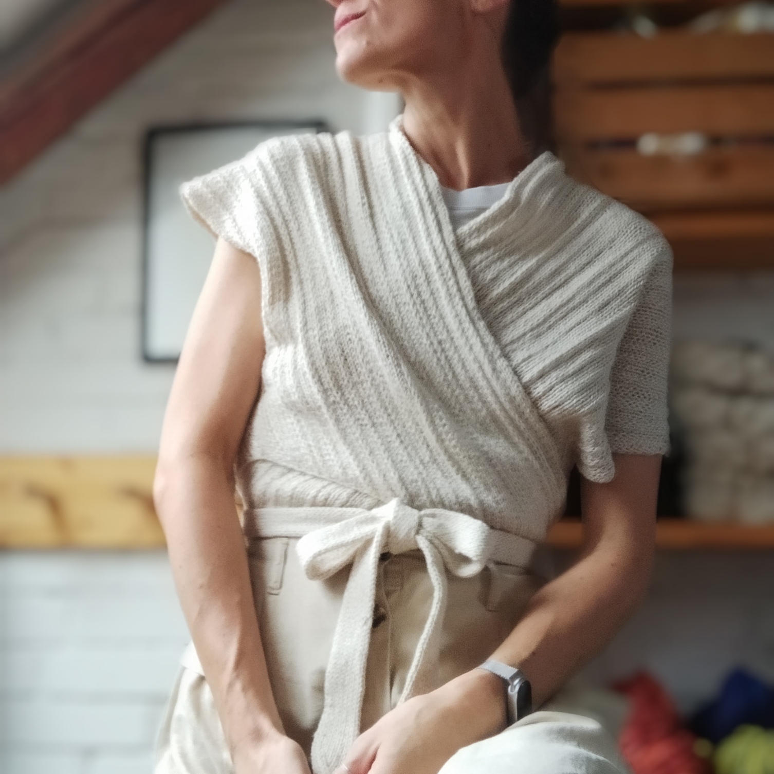 Ručne pletený, mäkkučký zavinovací top z českej bavlnenej priadze. Veľmi univerzálny, neformálny, lichotivý kúsok, ktorý sa hodí k nohaviciam či sukniam s vysokým pásom.