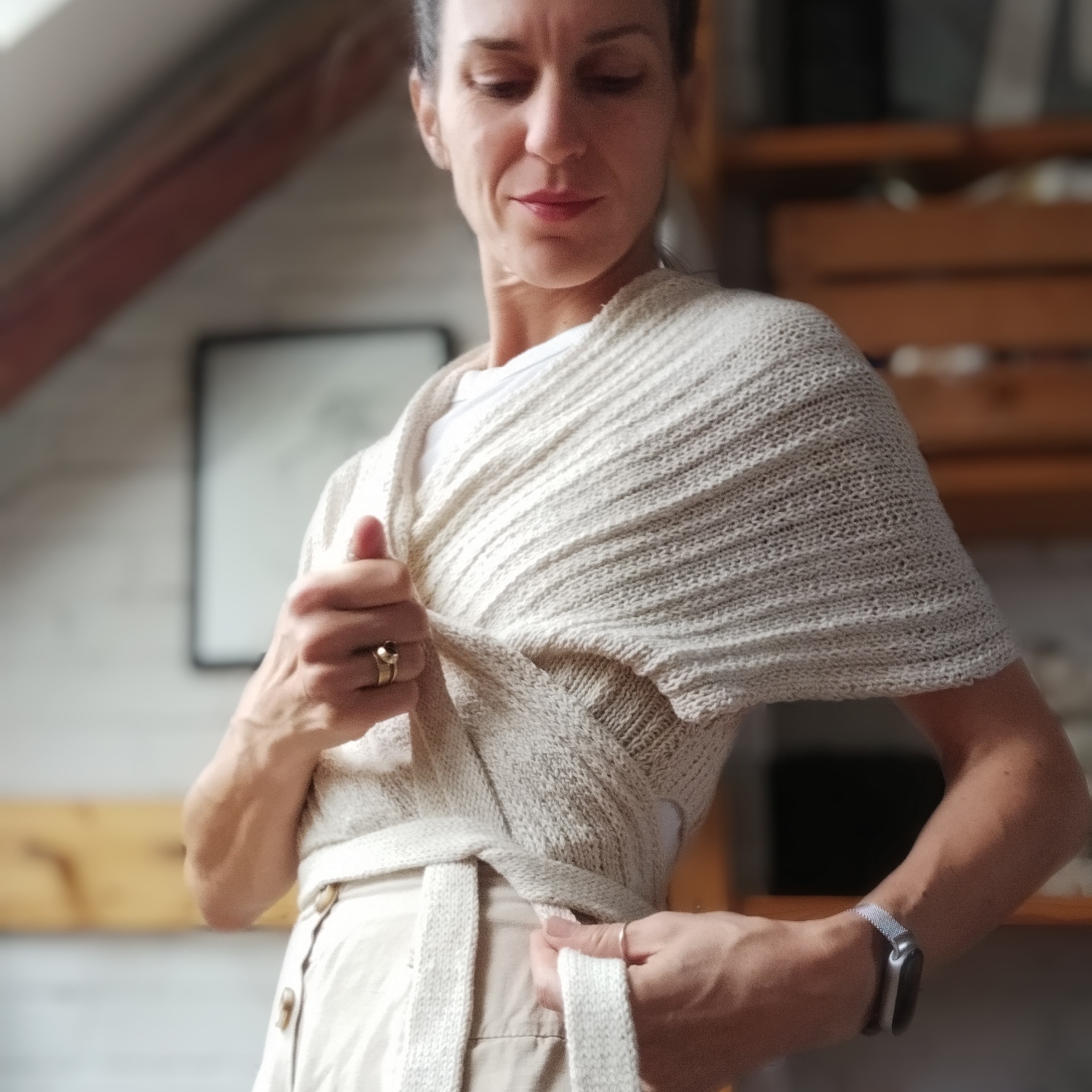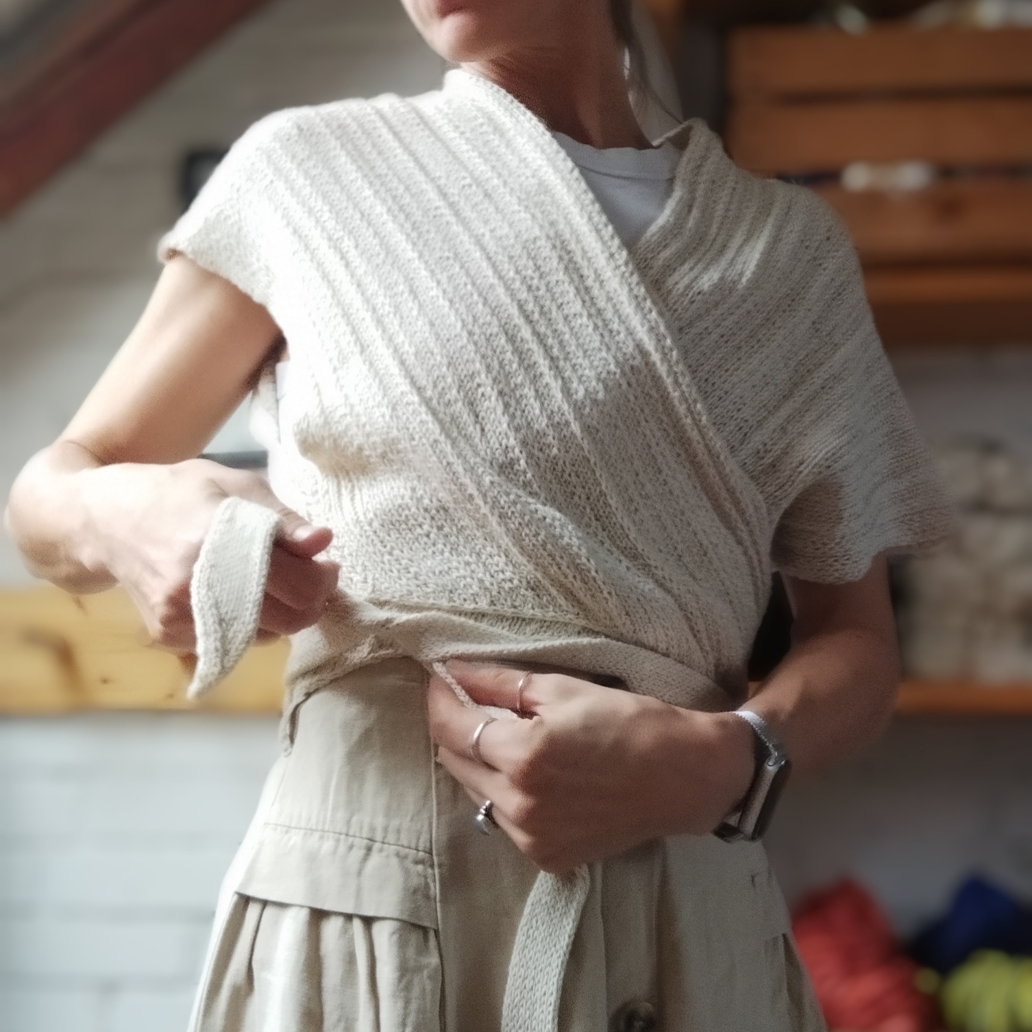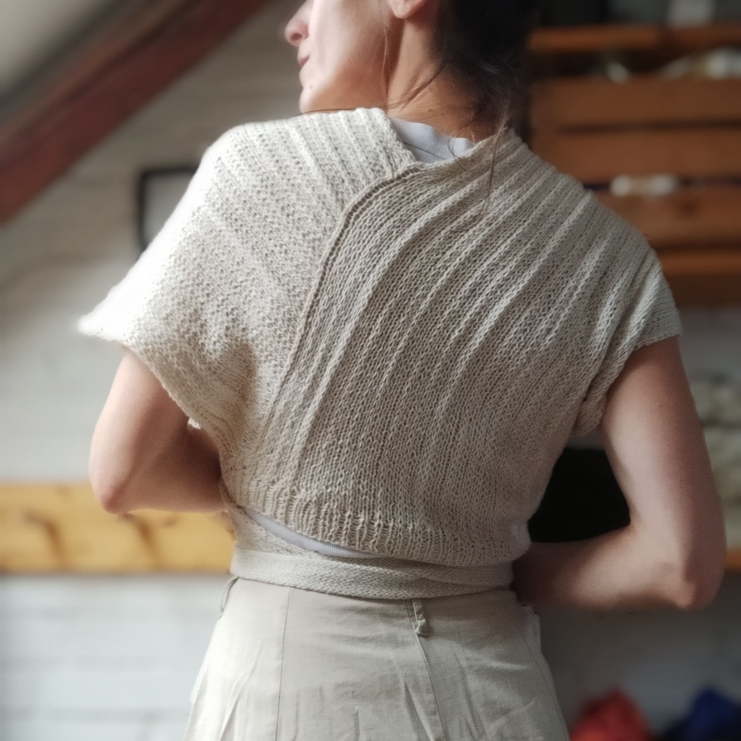 Ručne pletený, mäkkučký zavinovací top z českej bavlnenej priadze. Veľmi univerzálny, neformálny, lichotivý kúsok, ktorý sa hodí k nohaviciam či sukniam s vysokým pásom.