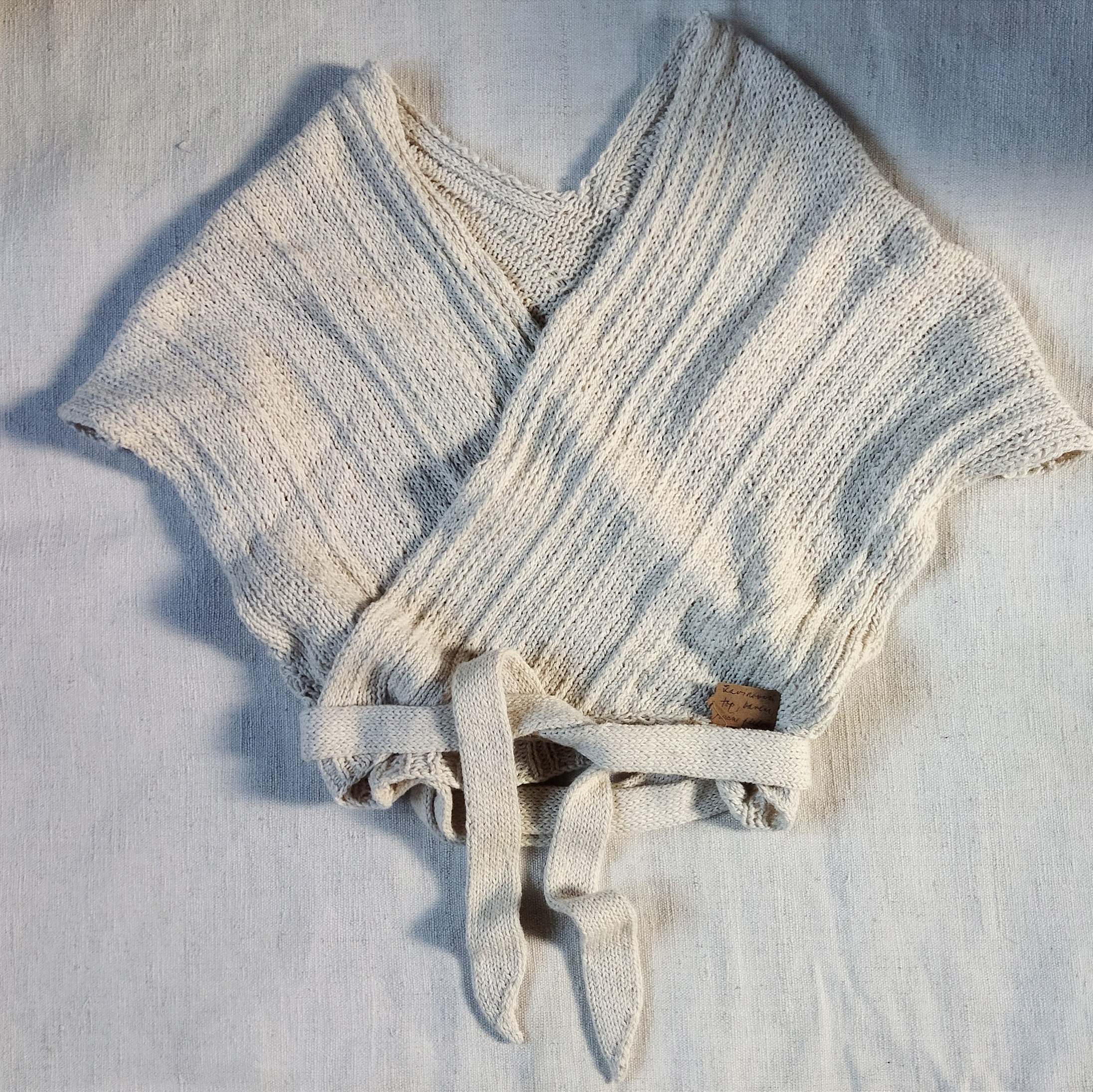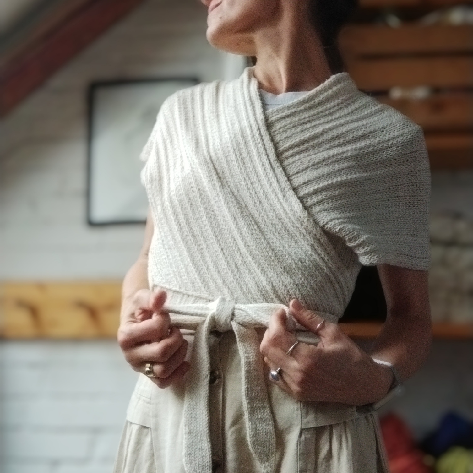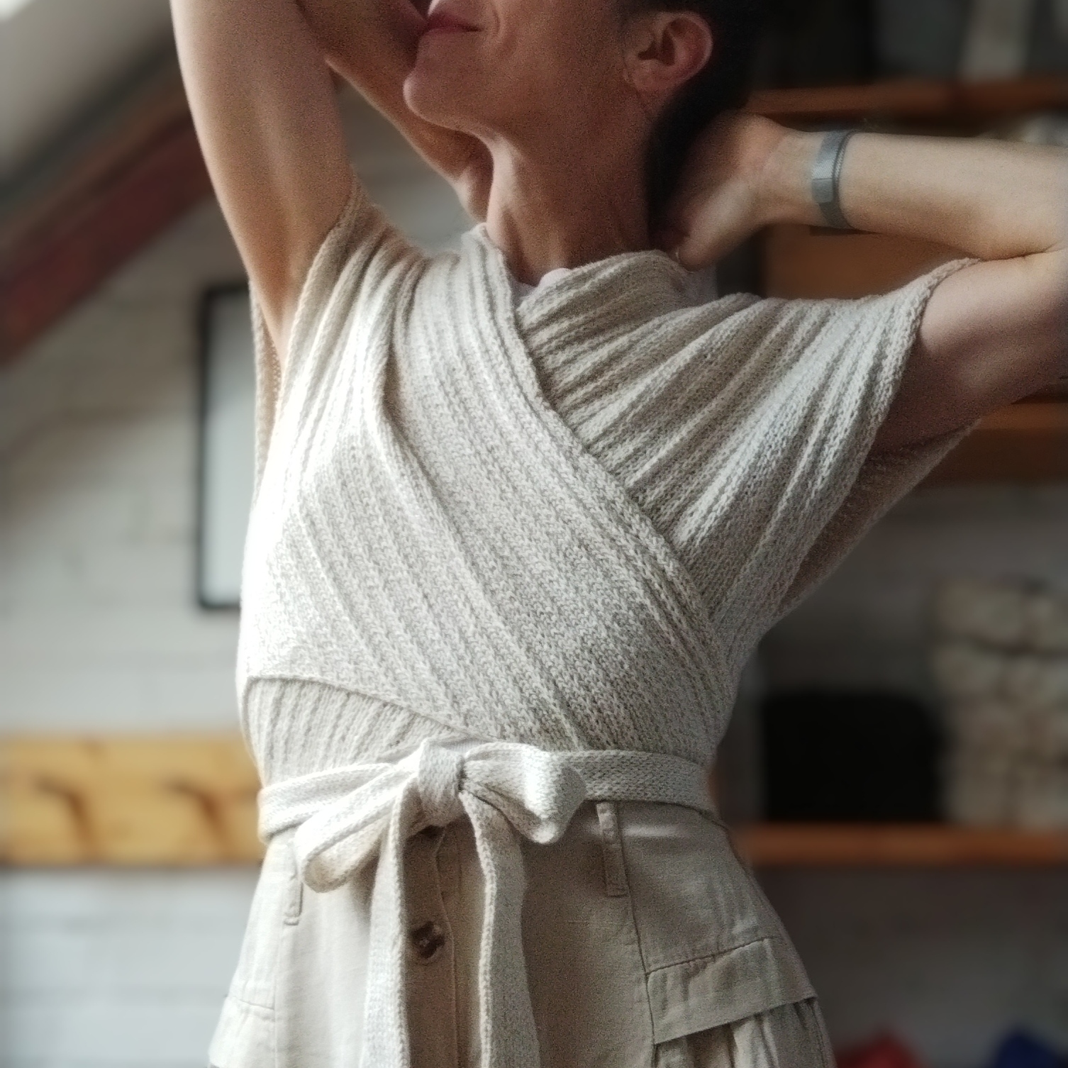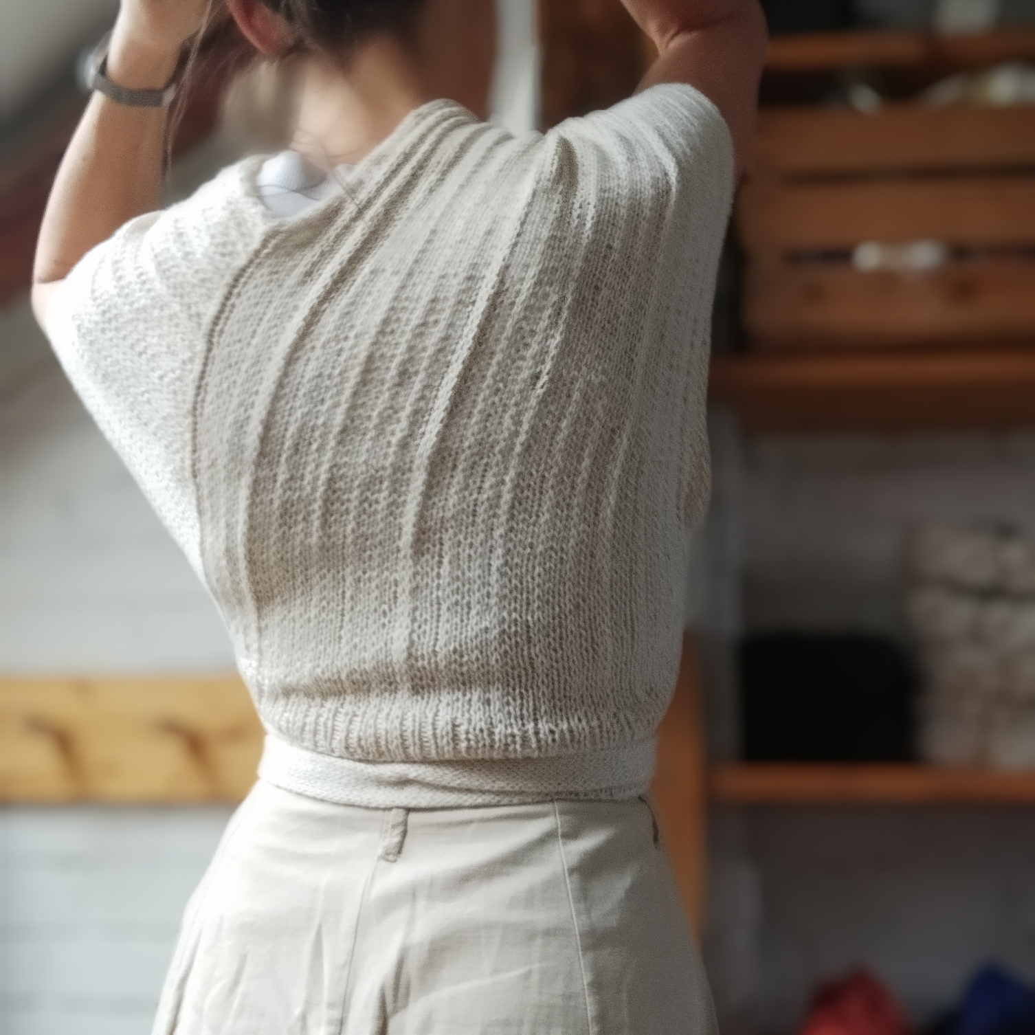 Ručne pletený, mäkkučký zavinovací top z českej bavlnenej priadze. Veľmi univerzálny, neformálny, lichotivý kúsok, ktorý sa hodí k nohaviciam či sukniam s vysokým pásom.