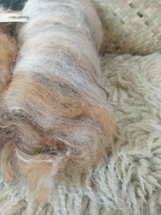 82g polovlneného, ručne namixovaného česanca – plátu, načesaného na ručnej česačke na vlnu (v zmysle že vlákna nie sú uplne paralelne).
