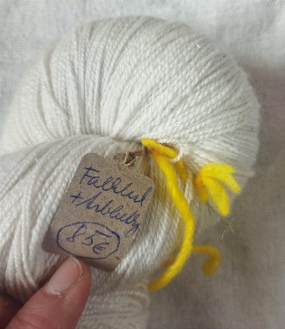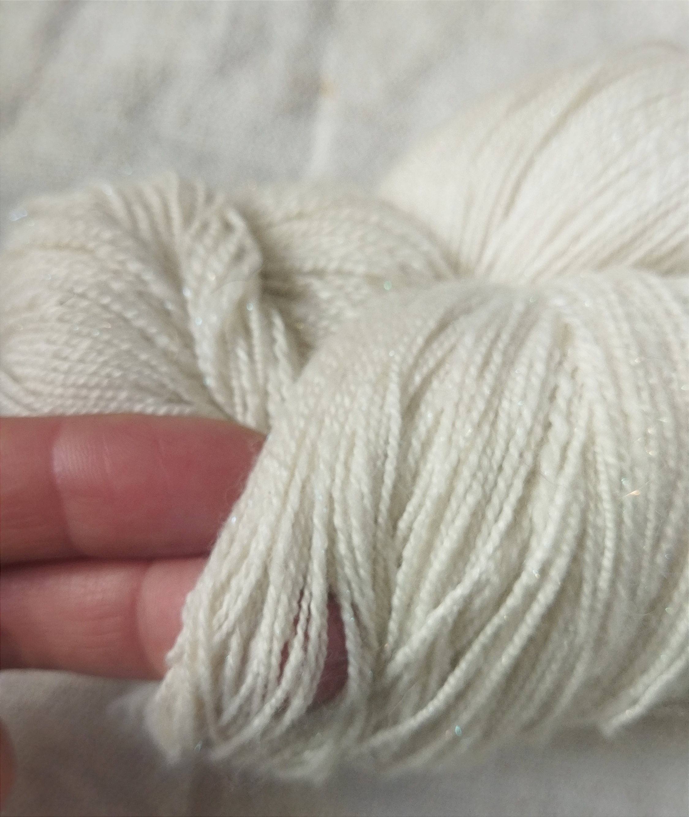 Jemnučké pradienko so štedrou metrážou 708 metrov, z mäkkučkej vlny oviec Falkland, načesanej s jemnými bielo-dúhovými trblietkami a spradené ručne na kolovrátku do tenunkej čipkovej priadze.