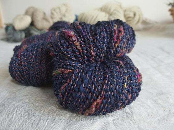 Merino je plemeno oviec, chované pre jemnú vlnu, takže táto je vhodná aj pre citlivé duše a pokožky, pre deti, bábätká, pre nosenie priamo na koži. Dvojnitka je robená so zreteľom na to, aby dodala jemnému merinu trochu viac pevnosti a odolnosti. Tieto pradienka boli kombinované s efektami v tvare zámotku/nopku s recyklovaného hodvábneho odpadu – v relatívne pravidelných rozostupoch teda nájdete pestrofarebné hrčky, ktoré v pletenine vytvoria krásnu štruktúru. Takto ozdobená jednonitka bola napokon zosúkaná s tenšou, ktorá farebne zodpovedá hodvábnym nopkom a výsledkom je príjemne starosvetsky pôsobiaca priadza 🙂